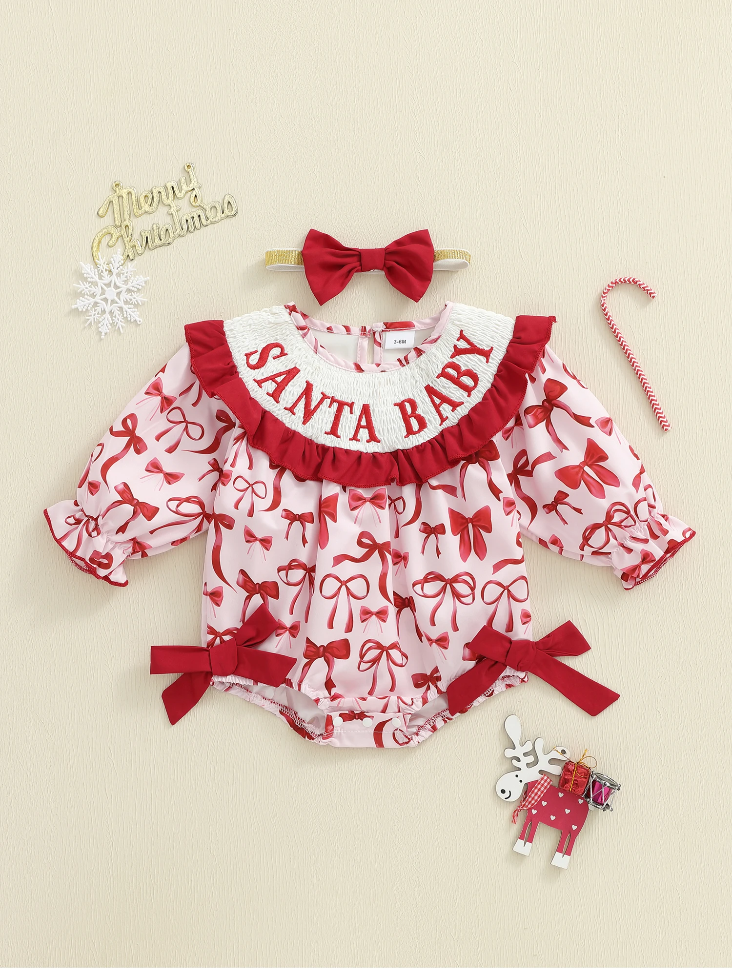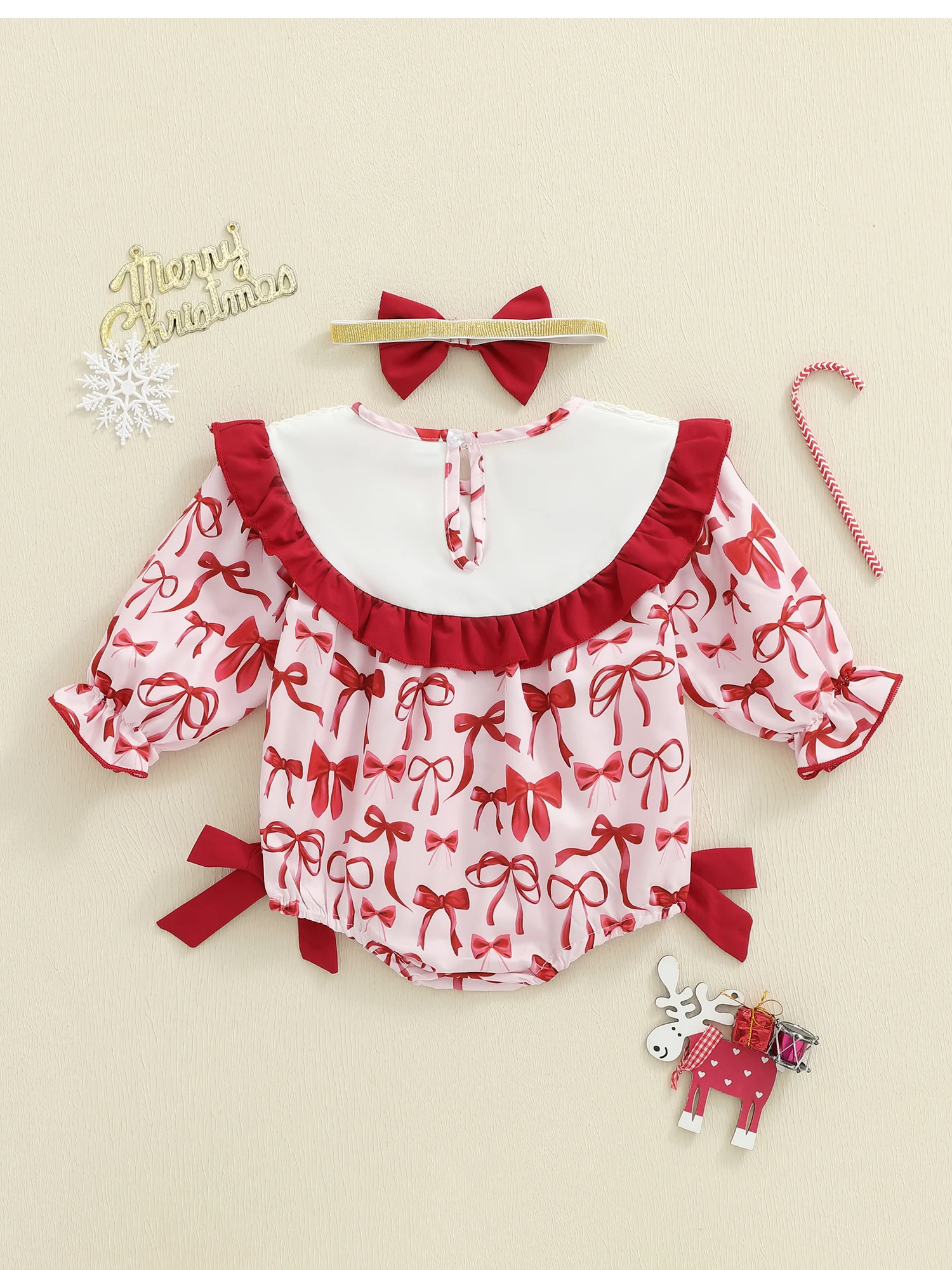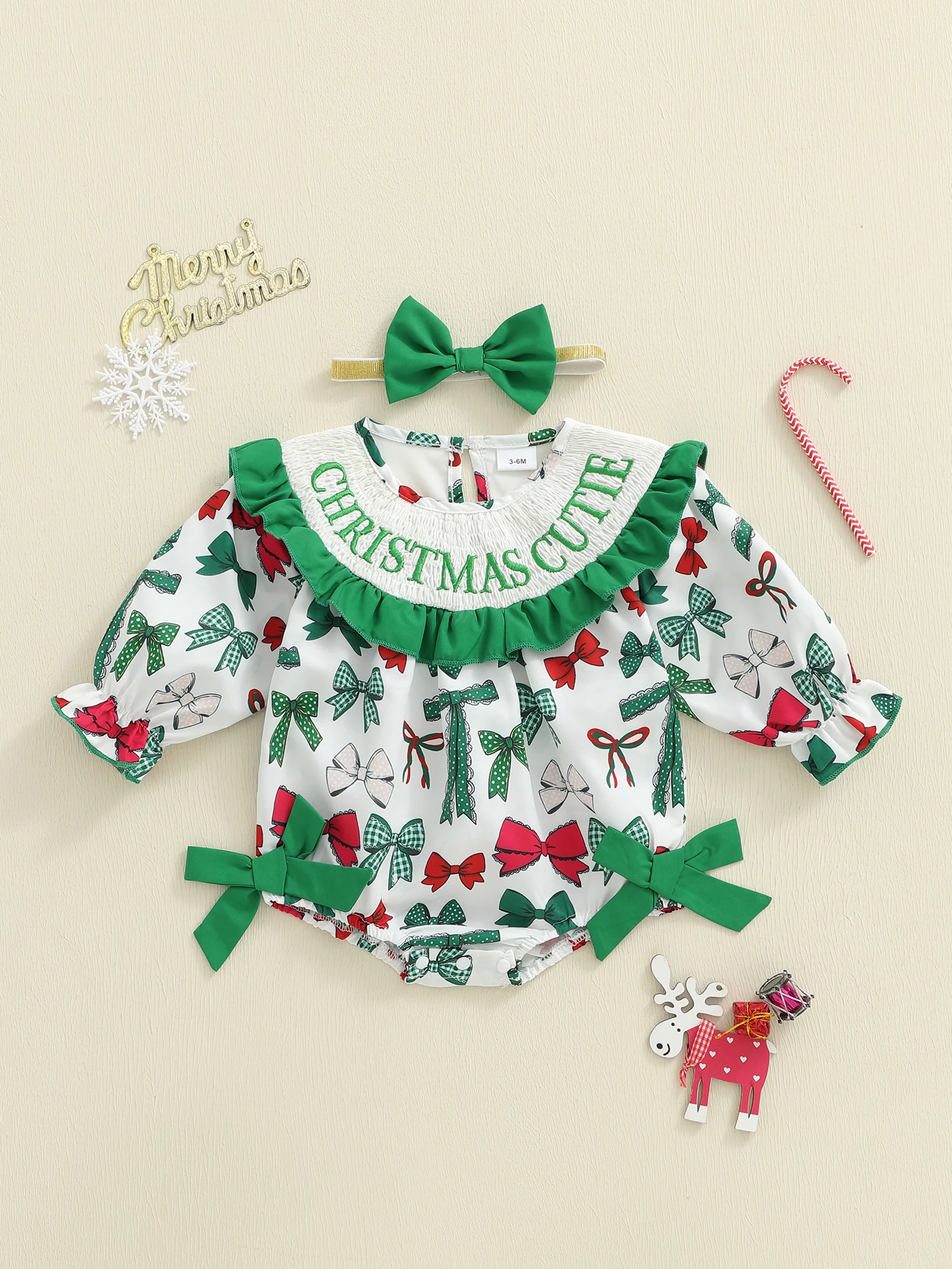 Baby Girl Christmas Outfit Bow Print Letter Embroidery Long Sleeve Romper Bow Headband 2 Piece Set