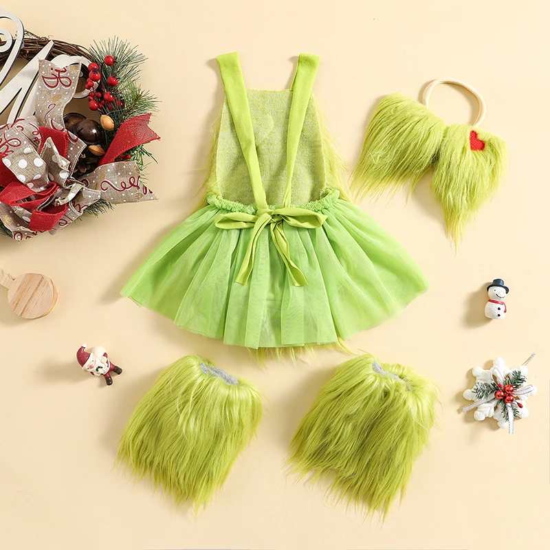 Christmas Cosplay Costume - Baby Girls 3Pcs Furry Sleeveless Romper Set - Leg Warmers and Headband Outfit for Holiday Party - P43