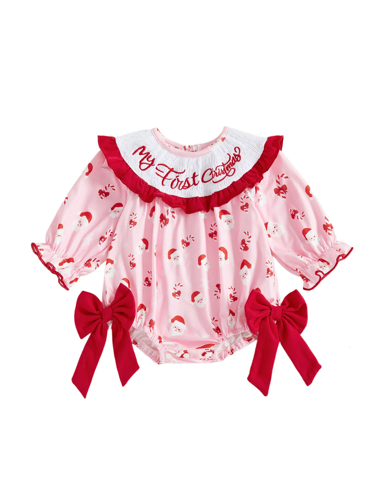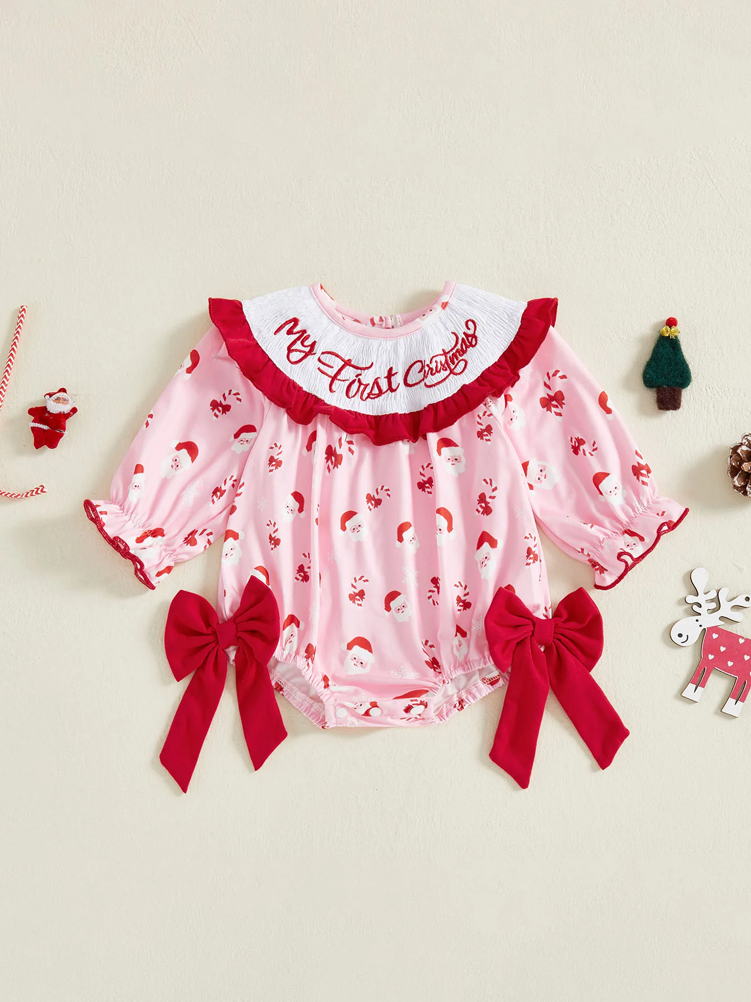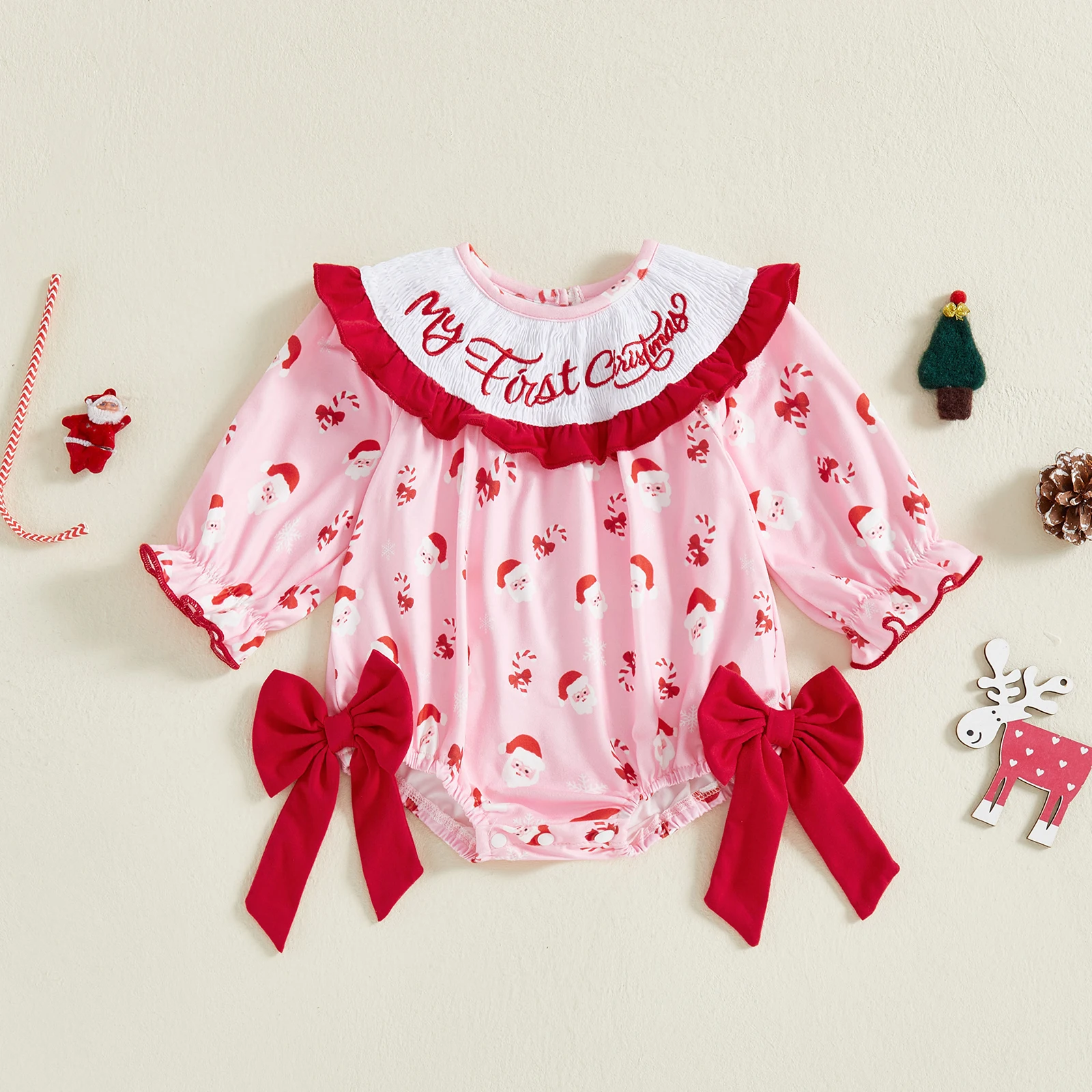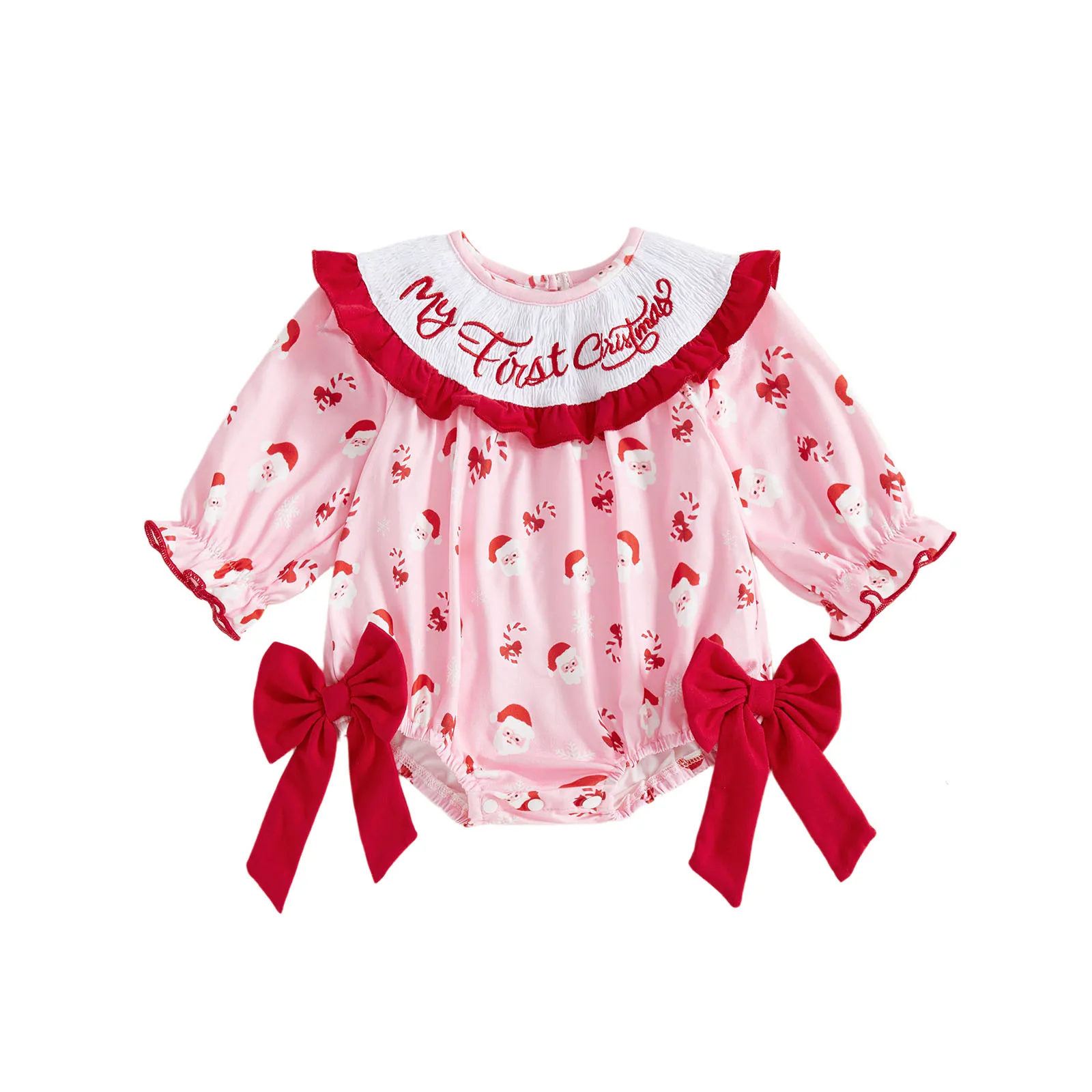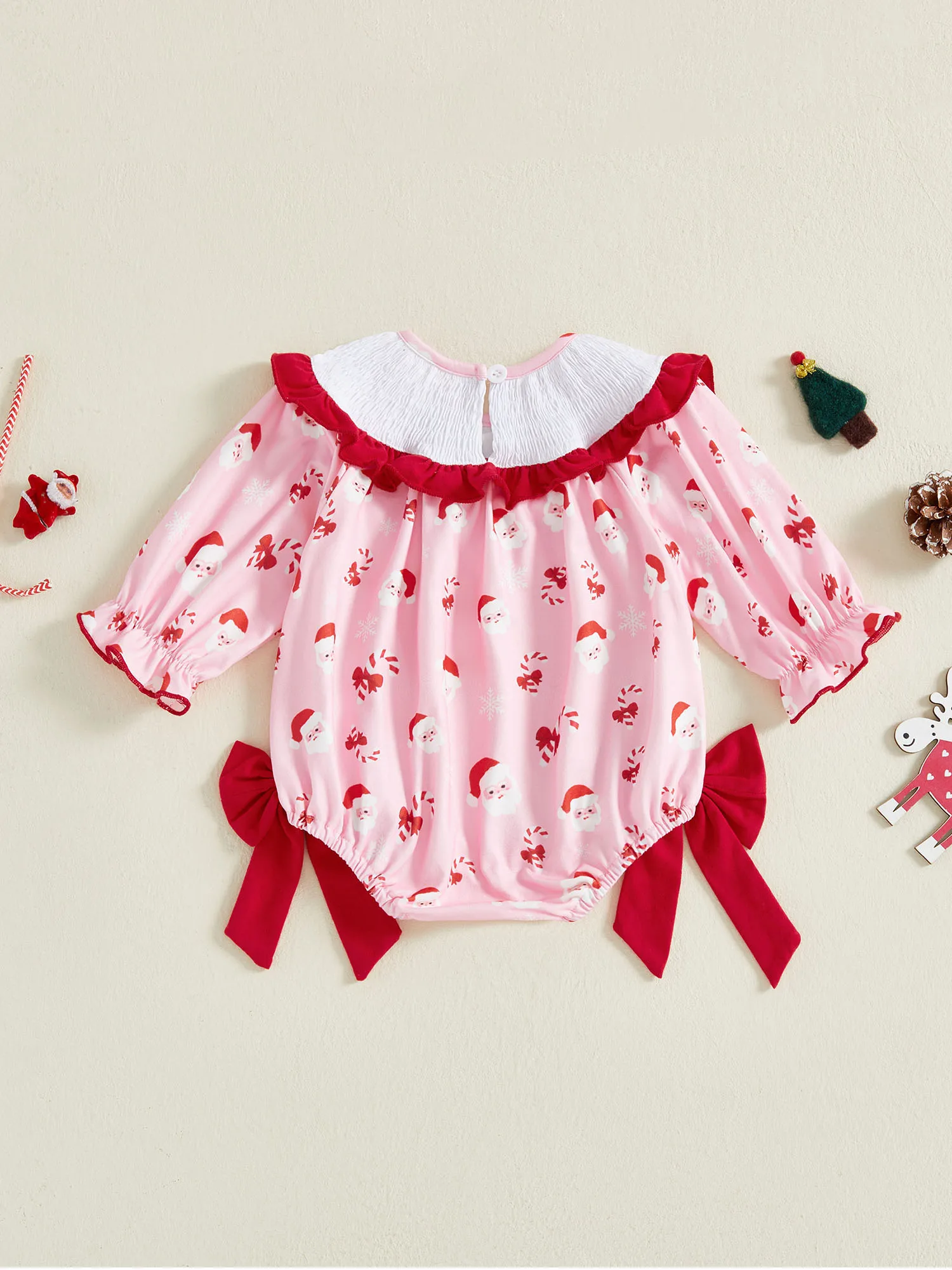 Baby Girl Christmas Romper Classic Long Sleeve Side Bow Santa Print Bodysuit Newborn Playsuit