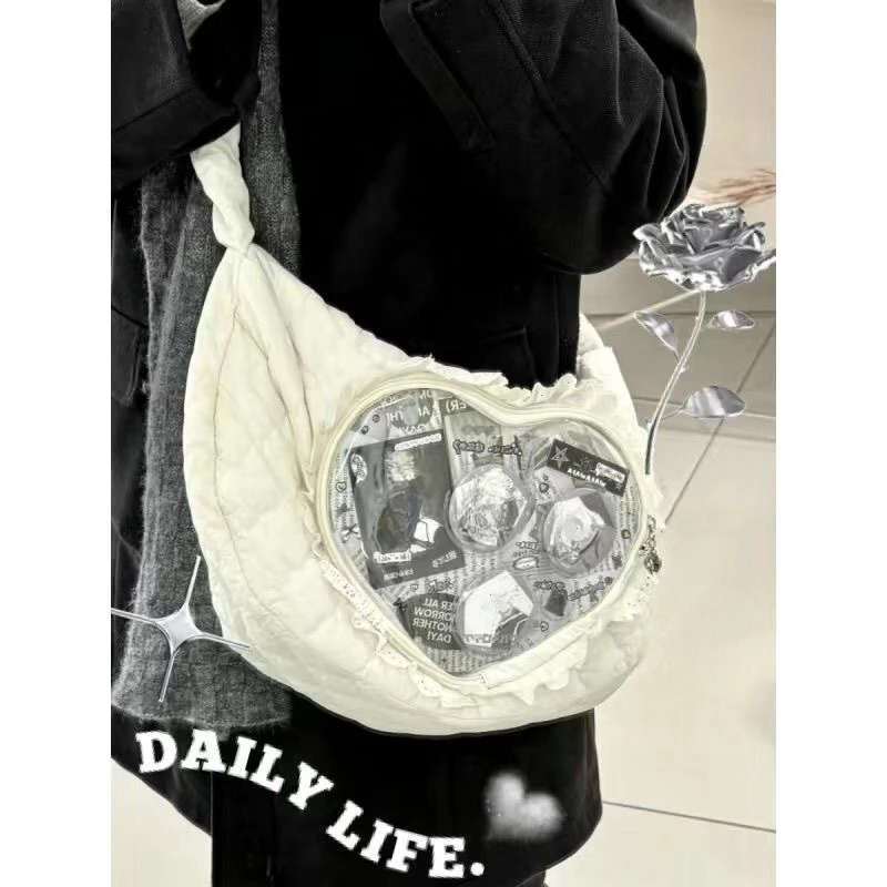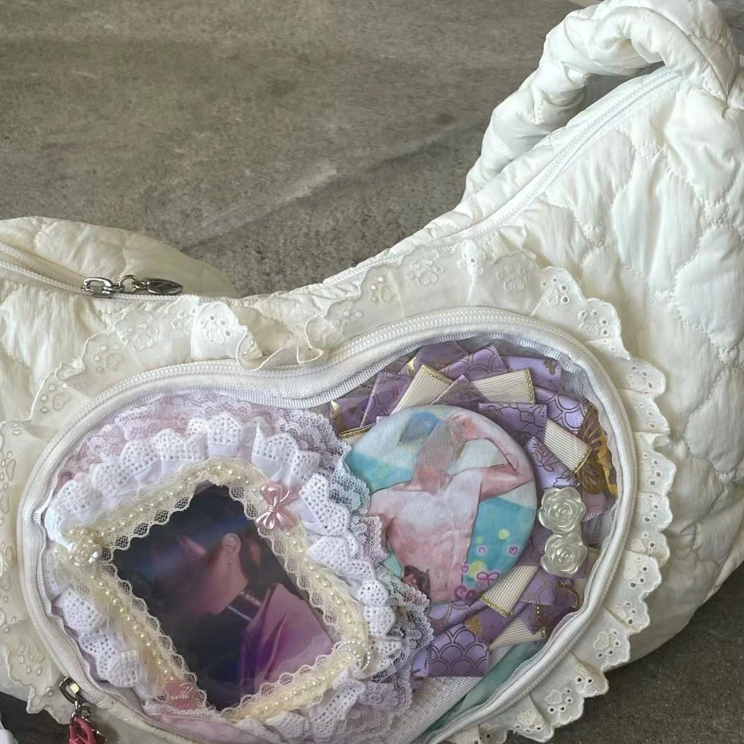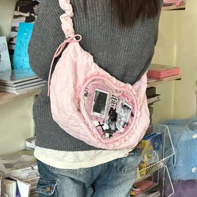 Pink White Cute Womens Shoulder Bag Pleated Love Heart Lolita Jk Ita Bag Drawstring Ballet Style Sweet Fashion Female Handbag